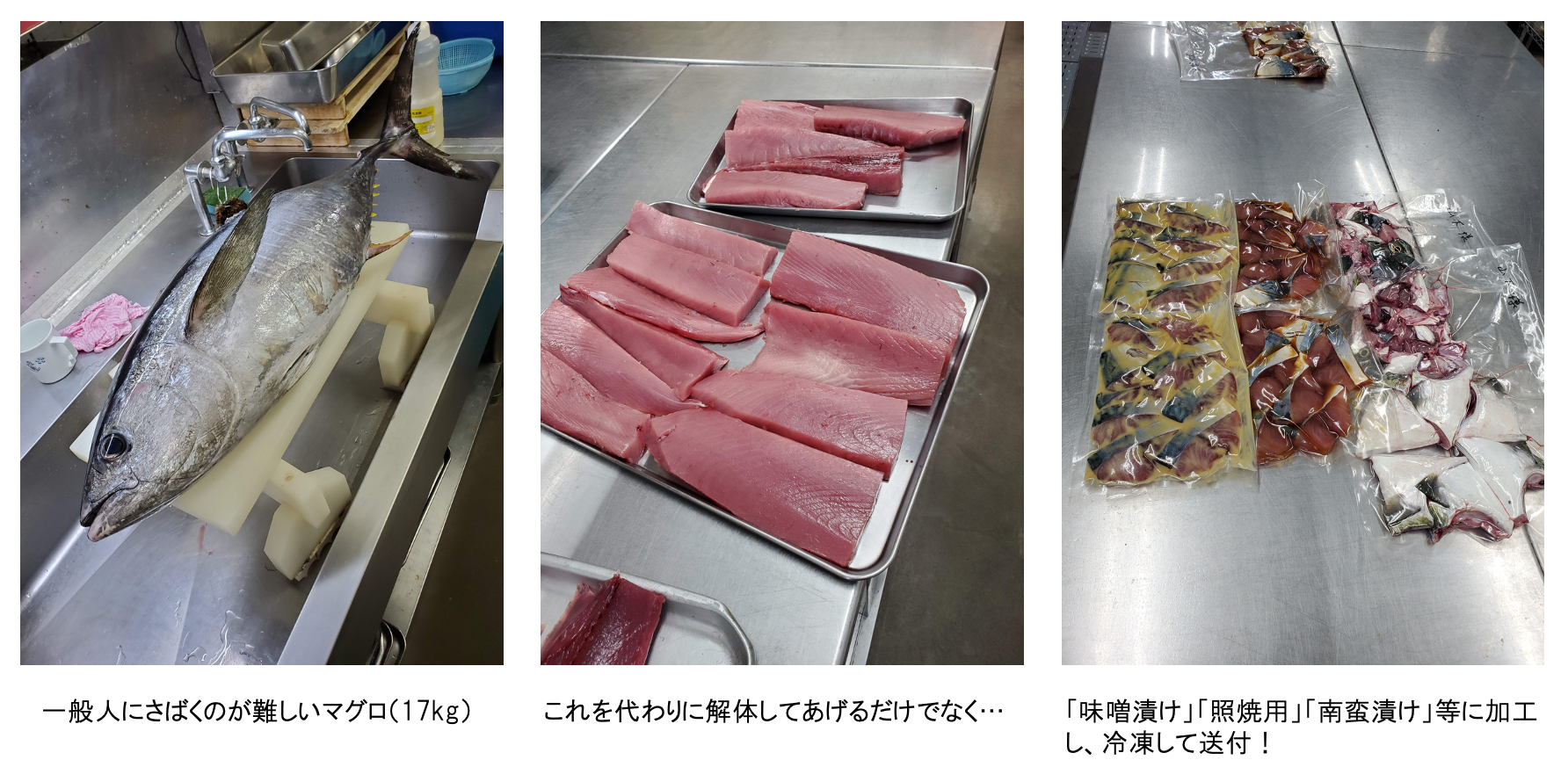 たとえば、17kgもあるマグロ! これを全部、刺身にしたところで、食べ飽きてしまいます…。そこで、「味噌漬け」「照焼用」「南蛮漬け」等の味付けをし、冷凍して送付するようなサービスも追加で行っていきました。